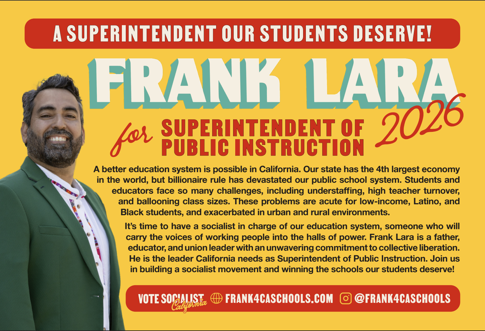 It takes a lot of people power and funds to make this campaign run. We want to maximize the visibility of our socialist program and put forth the idea that California should serve the people, not the billionaires. The resources exist to meet people’s needs and only the political will of the ultra-rich and their paid-for-politicians stands in the way.